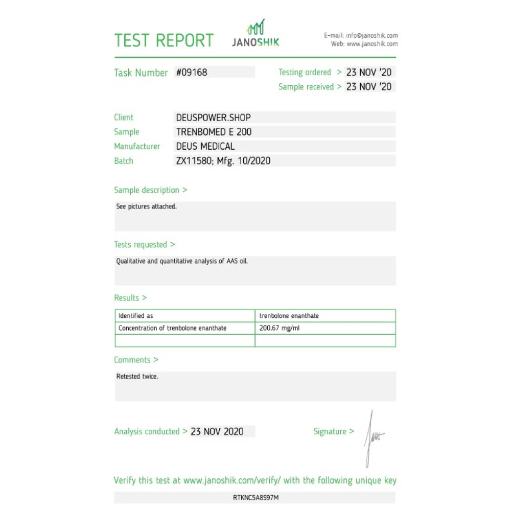 Specification TRENBOMED E 200 (TRENBOLONE ENANTHATE) INJECTABLE STEROID IN AMPOULES Deus Medical
